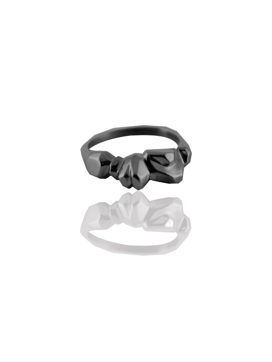 Chaque bague 010 est sculptée et polie à la main, comme un paysage miniature, avec des facettes asymétriques qui captent la lumière sous tous les angles.